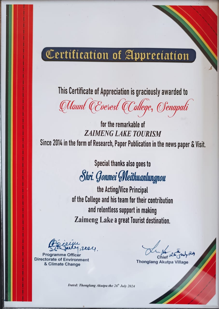 A certificate of appreciation is awarded to Mount Everest College by the Government of Manipur, Directorate of Environment & Climate Change and Zaimeng Joint Development Committee during the ‘Celebration of 1st Tadui Tako Festival’ on July 26-27, 2024. This Read more