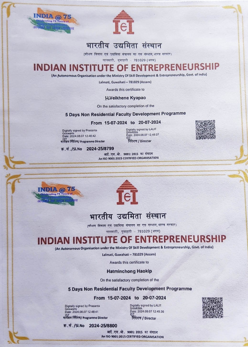 Three faculties of the college participated in the 5 Days Non Residential Faculty Development Programme from July 15 to July 20, 2024, organised by Entrepreneurship Development Centre, Hill College Tadubi, Government of Manipur, Senapati District, Manipur. List of participants: Read more